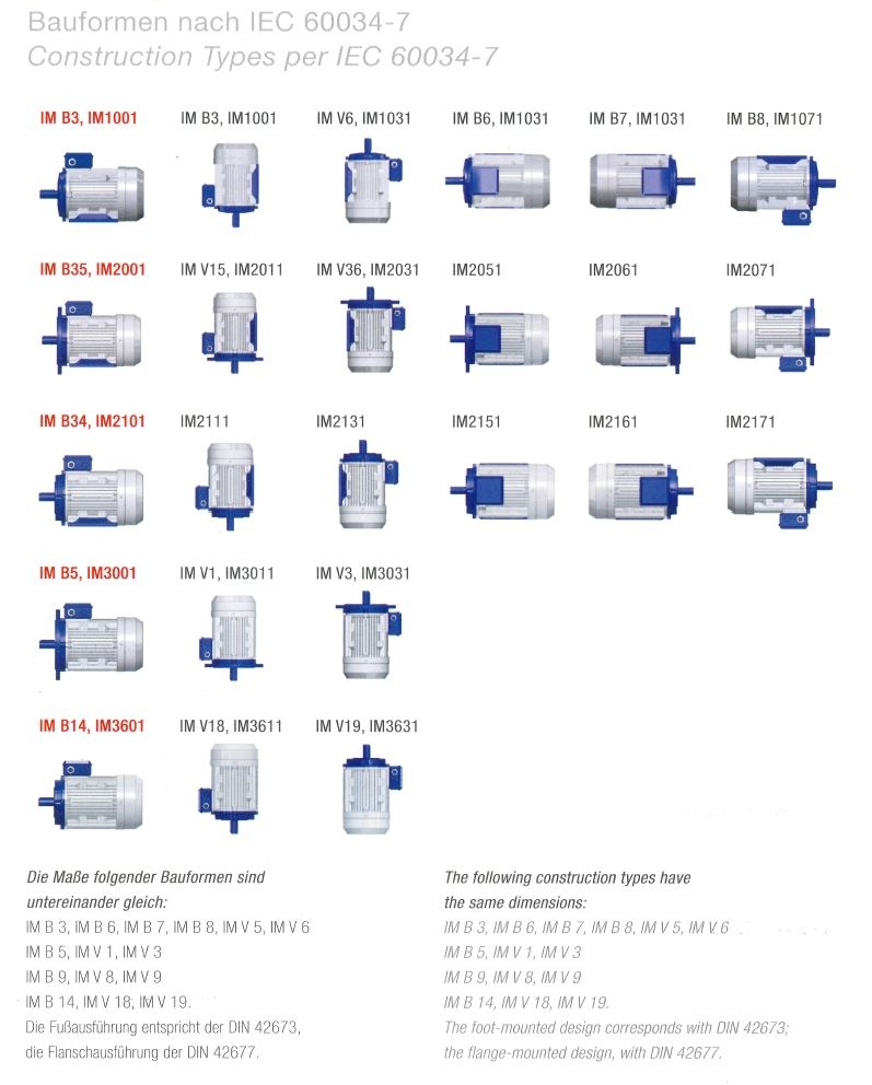 Los diseños se etiquetan con un código IM normalizado internacionalmente. IM significa Montaje Internacional. Este código tiene en cuenta la posición del eje del motor, el tipo de pantalla final, el montaje de la transmisión, el diseño del eje de transmisión y la instalación del motor.