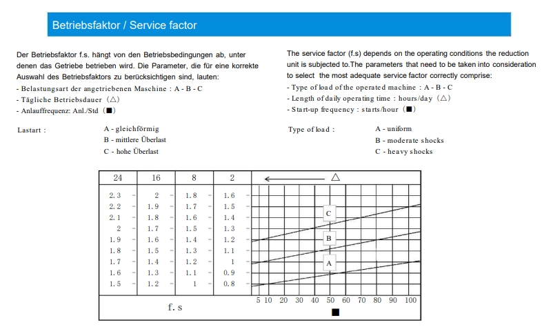 En la descripción de nuestros productos de motorreductores de tornillo sinfín se pueden encontrar normalmente los valores del factor de servicio o coeficiente del reductor. Encontrará una explicación al respecto en las instrucciones de funcionamiento.