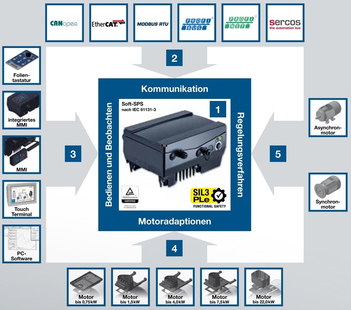 ofrece compatibilidad con casi todos los entornos de control habituales. El cliente puede seleccionar el sistema de bus que más le convenga y utilizar el EASYdrive Esto permite una integración ideal en el entorno de control de su aplicación.