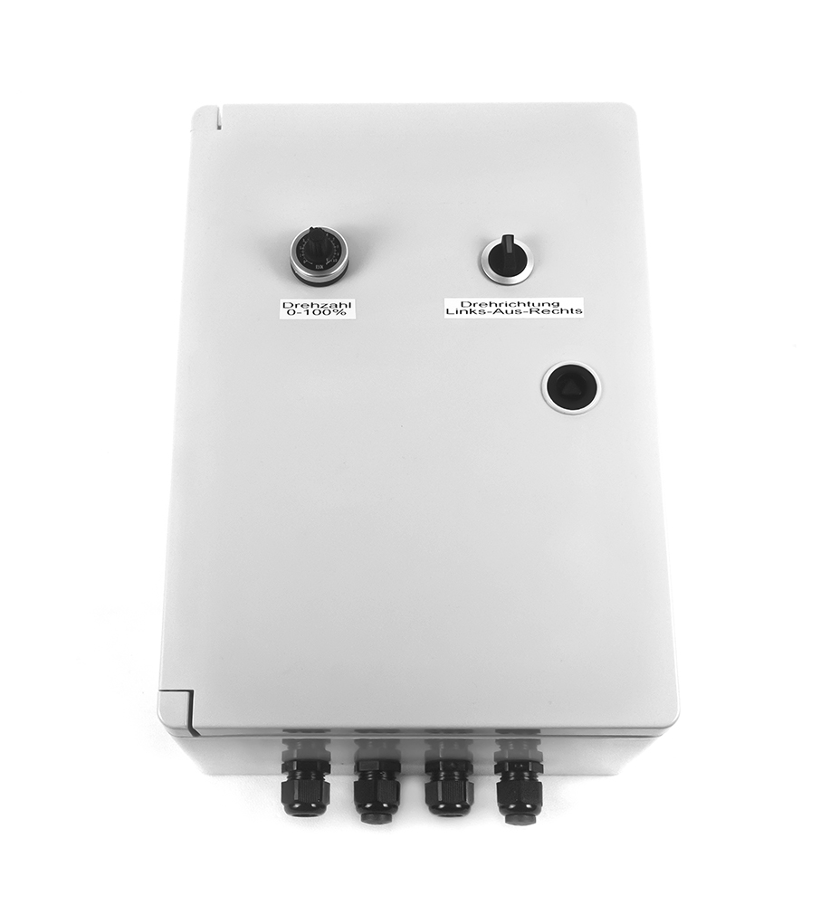 Control de velocidad para motores DC en la caja de control Unidad de control de motor de CC precableada con potenciómetro (5-10 kΩ), interruptor de rotación de izquierda a derecha y control de motor montado en la caja de control. El control de velocidad es adecuado para motores CC de hasta 500 W / 40 A. Tiempos de encendido y apagado del motor:- Rampa de aceleración: 0,5 - 10 s- Rampa de desaceleración: 0,5 - 10 s Características especiales:Temperatura ambiente: 0°C / +40°C (alarma bajo cero) Dimensiones:350 mm x 250 mm x 155 mmAtención: La protección eléctrica individual debe realizarse en obra por personal cualificado!   Alle Produktfotos sind unverbindliche Beispiele! Technische Änderungen vorbehalten.