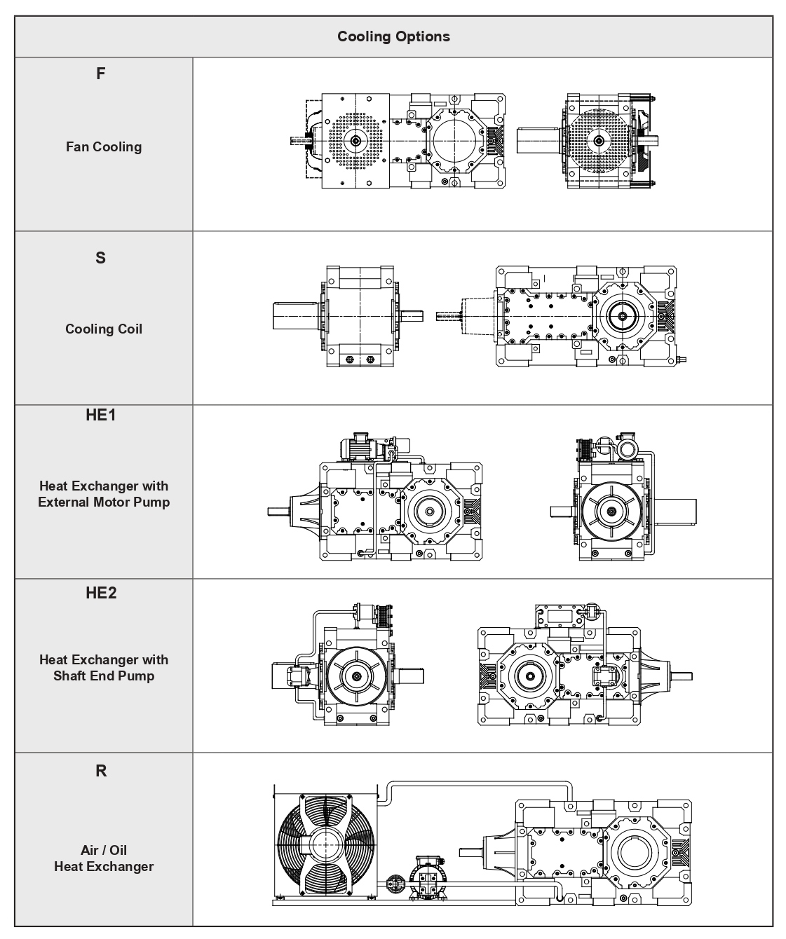 Aquí puede ver un resumen de las opciones de refrigeración para los reductores de engranajes cilíndricos horizontales.